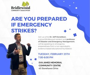 Join the Bridlewood Community Association when Dr. Jeff Donaldson speaks on emergency preparedness from non-apocalyptic evidence based educational foundation on the